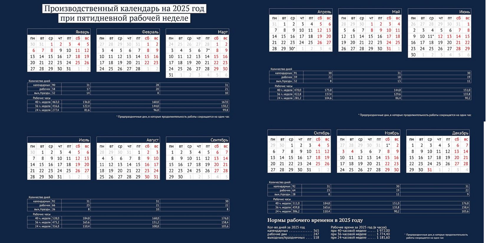 В 2025 году будет 365 календарных дней, из них рабочие дни — 247, выходные и праздничные — 118 дней. Россияне проведут на работе 1 972 часов при условии пятидневной рабочей недели по 8 часов.
