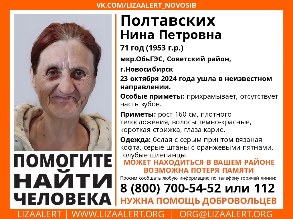 В Советском районе Новосибирска пропала 71-летняя Нина Полтавских. Об этом рассказали в группе «ЛизаАлерт» во «ВКонтакте».