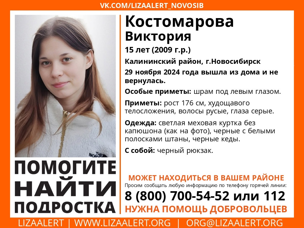 В Калининском районе Новосибирска пропала 15-летняя Виктория Костомарова. Девочка 29 ноября вышла из дома и не вернулась, сообщает поисковый отряд «ЛизаАлерт».