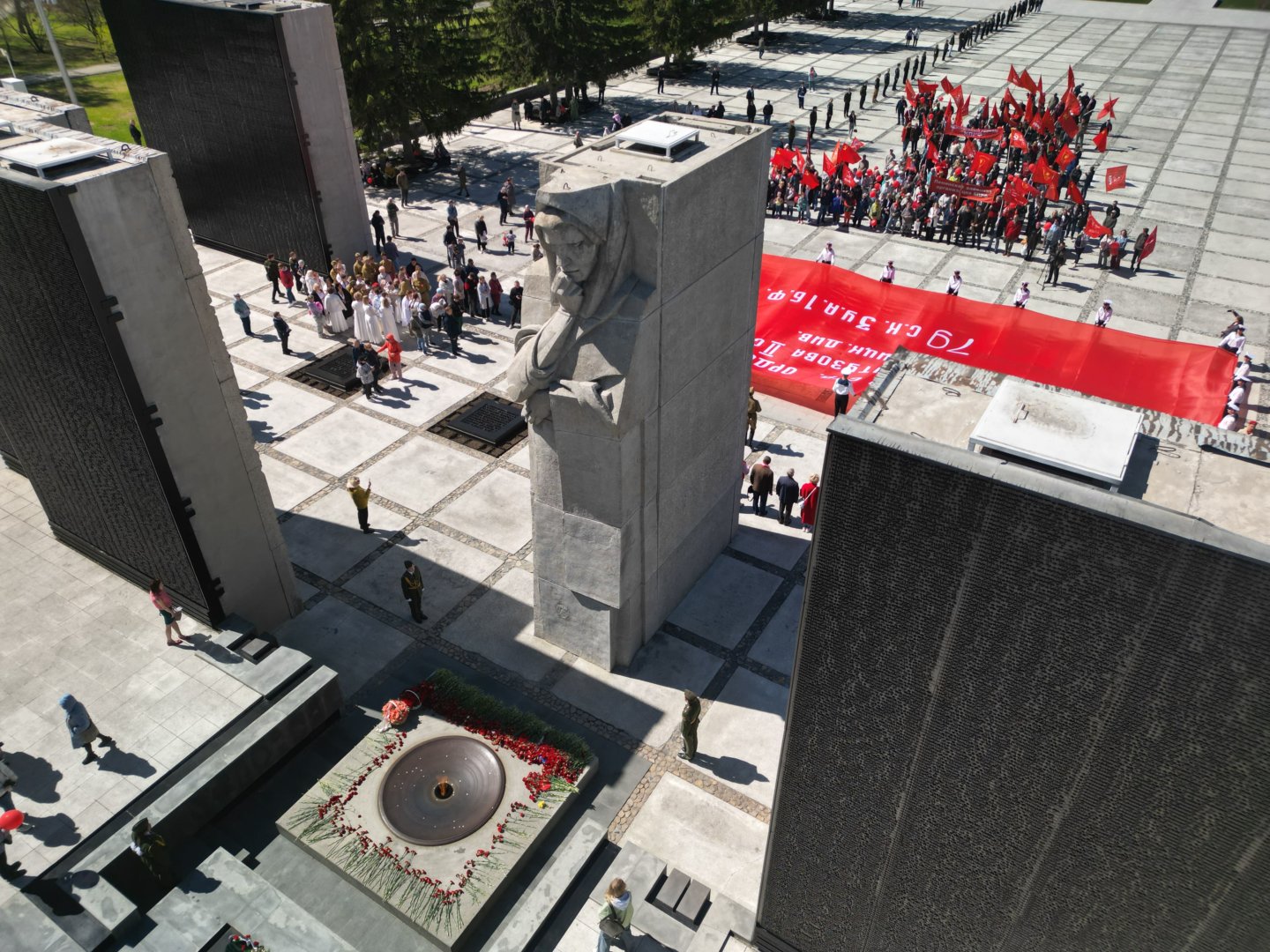 1 мая 2025 года на Монументе Славы в Новосибирске прошли торжественные мероприятия, объединившие День международной солидарности трудящихся и подготовку к 80-летию Победы. Центральным событием стало развертывание 200-метровой копии Знамени Победы, доставленной в город в рамках марша-эстафеты «Наша Великая Победа».