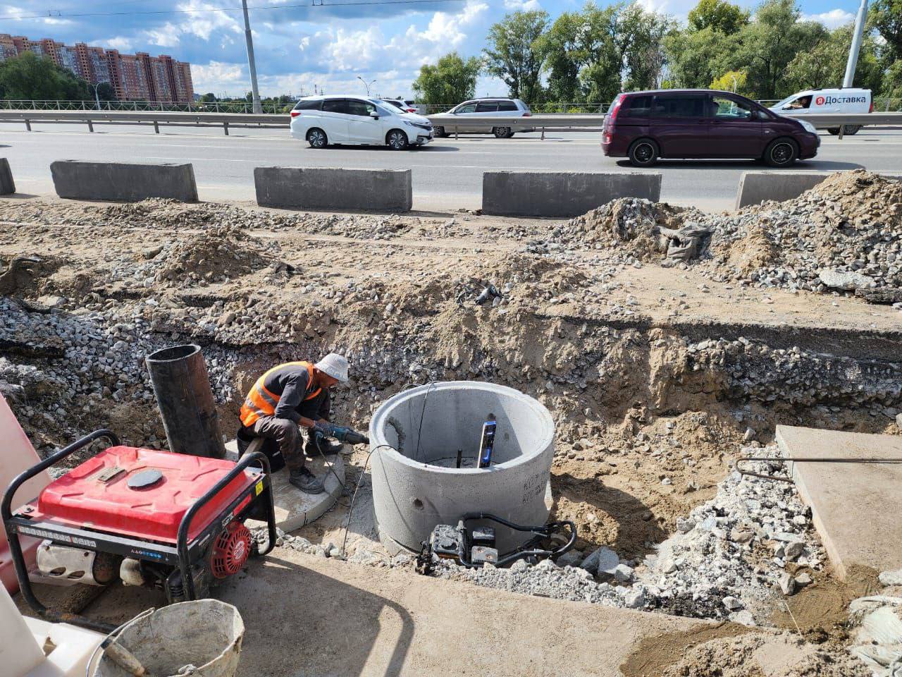 Осуществляется монтаж двух пар систем дождеприёмника с обеих сторон в месте размыва. Со стороны движения на правый берег система готова. Осталось лишь завершить укладку асфальта и привести данный участок в порядок после ремонта. Затем коммунальные службы приступят к установке дождеприёмника в сторону левого берега около остановки «Метро «Спортивная». Временно будет огорожена часть проезжей части.