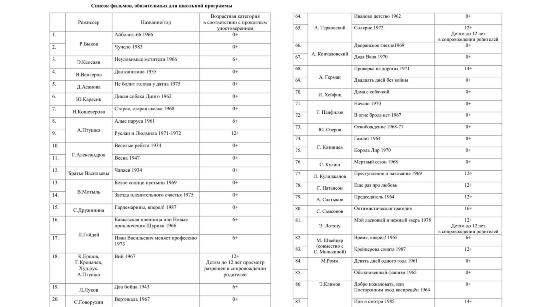 Минпросвещения опубликовало список из 100 фильмов, обязательных для школьной программы. Информация об этом появилась на сайте министерства. Рекомендации по изучению произведений отечественного кинематографа были направлены в образовательные учреждения регионов.
