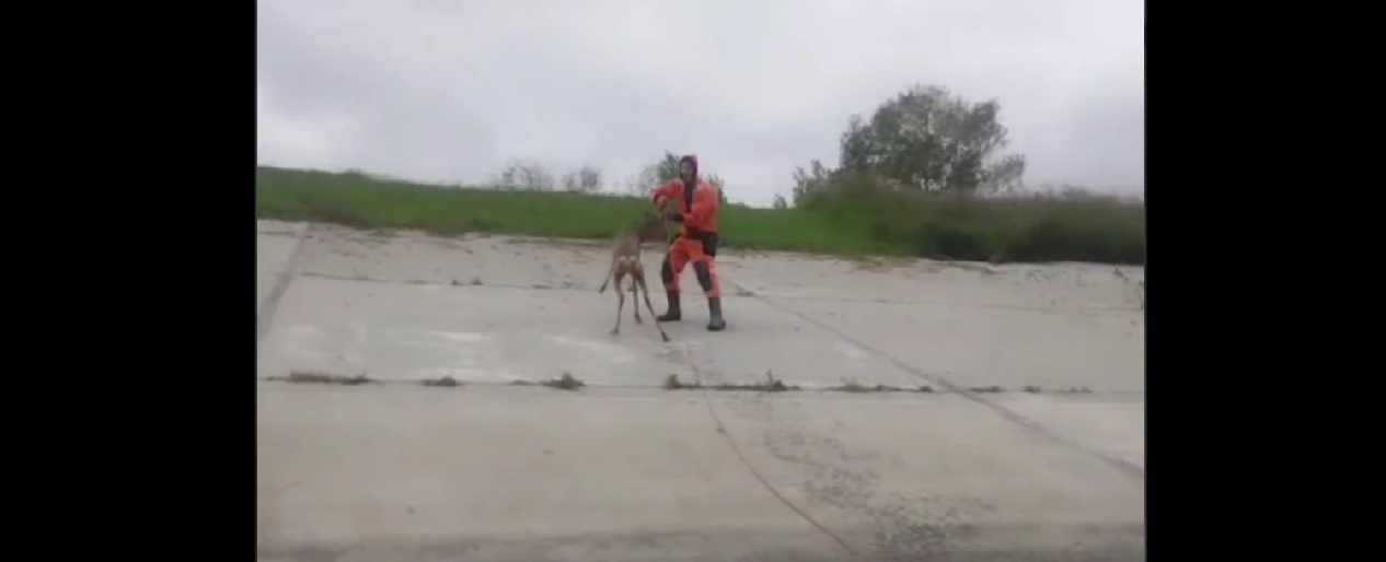 Как видно на кадрах, животное не могло выбраться из воды на бетонный берег, поэтому ей потребовалась помощь. Это не первый случай, зафиксированный в этом месяце.