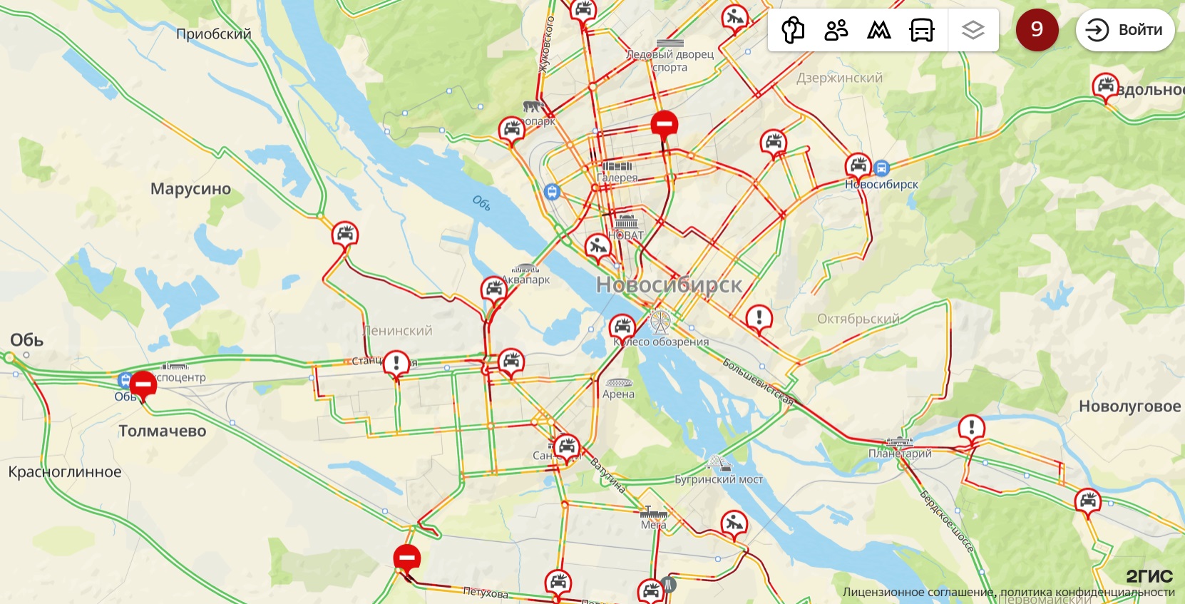 Ситуация в Новосибирске оценивается сервисами в 9 баллов. По данным дорожных карт, движение затруднено на подъездах к мостам, также бардовым цветом на карте 2GIS помечены улицы: Ипподромская, Фрунзе, Богдана Хмельницкого, Волочаевская, Гоголя, проезд Энергетиков.