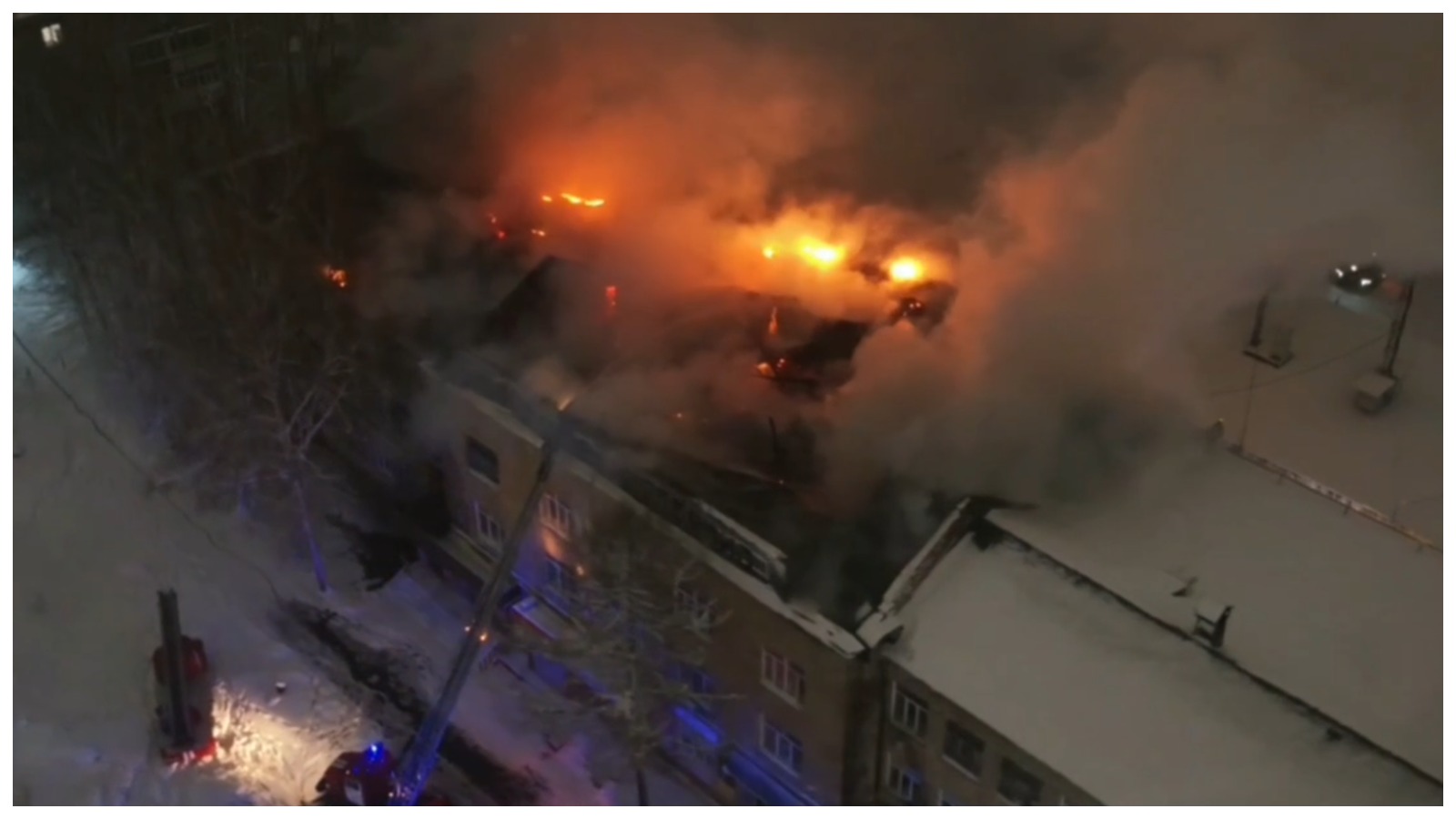 Утренний пожар в цеху по изготовлению мебели на Тургенева, 261 предположительно начался на третьем этаже, далее огонь перекинулся на кровлю и распространился на всё здание. Специалисты оценивают площадь возгорания примерно в тысячу квадратных метров.