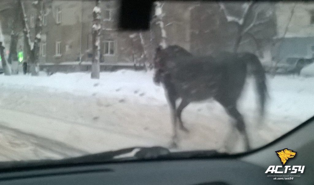 Одинокий конь бродит на одной из новосибирских дорог